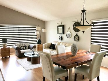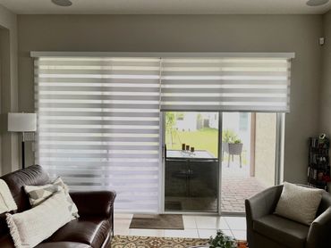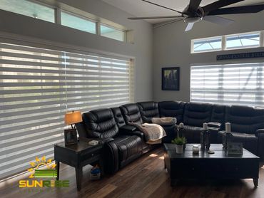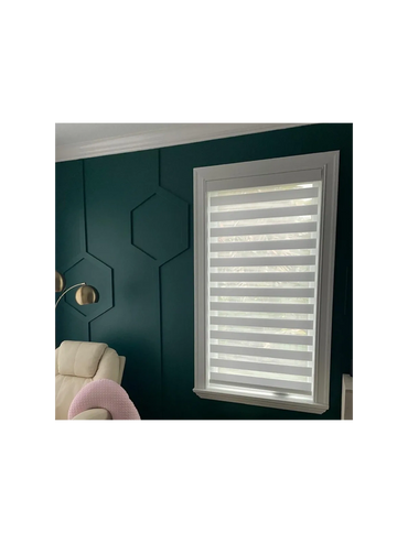 Zebra Shades are a unique type of shade offering light filtering and room-darkening effects through a zebra-like pattern. These shades feature a dual-layer fabric consisting of sheer mesh and opaque fabric slats, allowing for easy adjustment of light levels by raising or lowering the shade. One great feature of these shades is that they can be motorized, and the fabric is dust-repellent.
